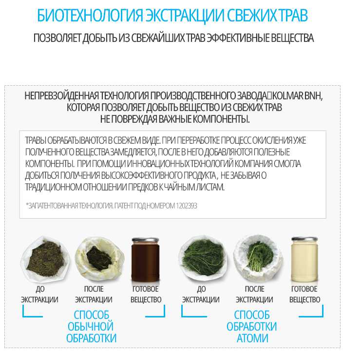 Именно благодаря технологии высокой степени очистки и биотехнологии экстракции из свежих трав удаётся сохранить сырьё без окисления и позволяет добыть из свежайших трав эффективные вещества не повреждая важные компоненты.